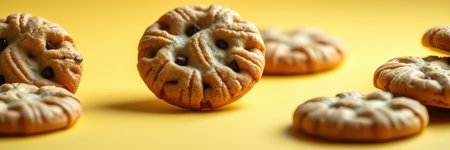 Freshly baked cookies arranged on a vibrant yellow background showcasing delightful textures and flavors