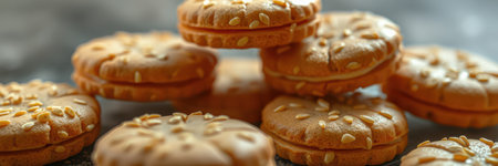 Delicious sesame cookies stacked on a wooden surface ready to be enjoyed in a cozy kitchen