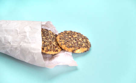 cookies on blue background. oatmeal cookie with pieces of chocolate