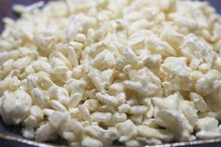 Churmure or murmure or moori, Puffed rice, food ingredient. Traditional food isolated on yellow background.