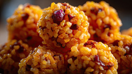 A close-up view of golden snack balls made with crispy rice and spices, showcasing a vibrant texture and inviting appearance on a wooden surface.