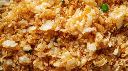 Close-up view of crispy fried onion bits showcasing a golden texture, perfect for enhancing flavors and garnishing various dishes and meals.