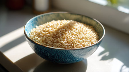 A bowl of dry brown short-grain rice placed on a kitchen counter with sunlight highlighting the details of the grains.