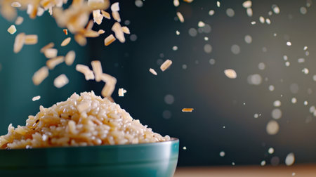 A mesmerizing close-up image captures rice falling elegantly into a bowl, showcasing the beauty of cooking with fresh ingredients and simple aesthetics.