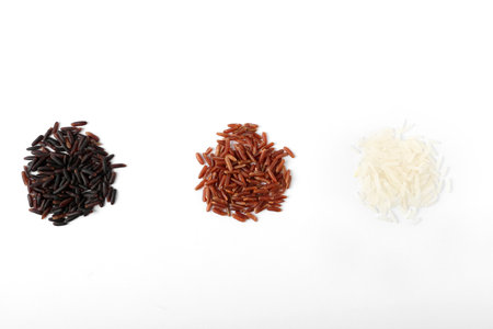 Food background with of rice variety . rice mixture. brown rice, black rice, white rice.
