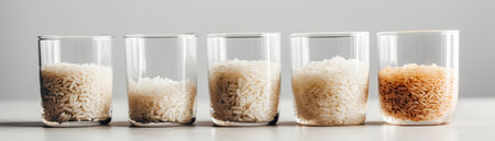 Various types of rice : Brown rice, Jasmine rice, Riceberry ceramic cup. Organic raw rice collection, Healthy food Selective focus.
