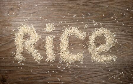 Natural rice closeup. Organic dry food, Asian diet, small grains with rough texture. Healthy nutrition. Selective focus on the details, blurred background.