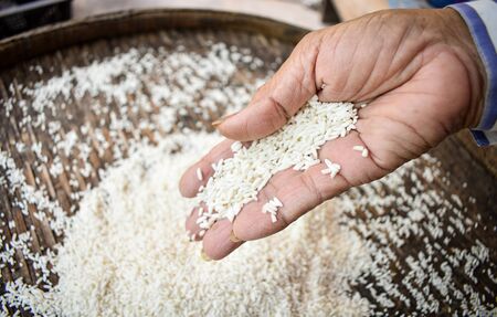 Close up Thai women holding jasmine rice in their hands. Health food products.