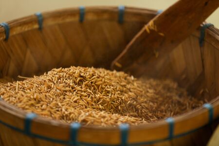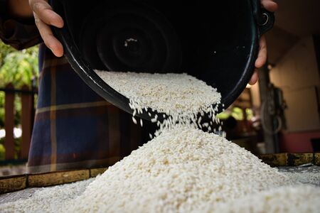 Close-up of White rice group on the threshing basket. Select focus shallow depth of field.