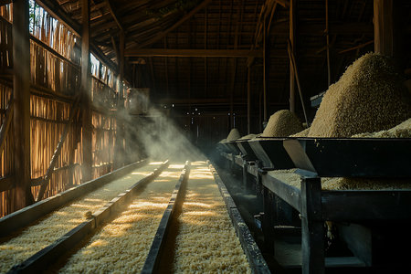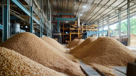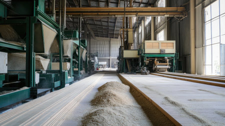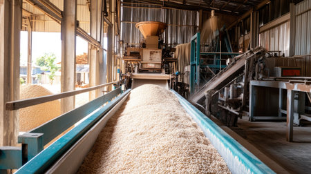 Captivating view of rice processing at a modern mill. Machinery operates efficiently, transporting raw grains through the production line.