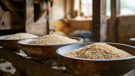 A detailed view of a traditional grain mill, showcasing freshly ground grains, rustic tools, and an artisanal approach to food production in a sustainable workshop environment.