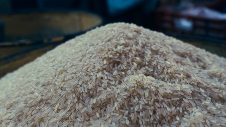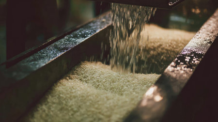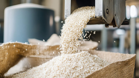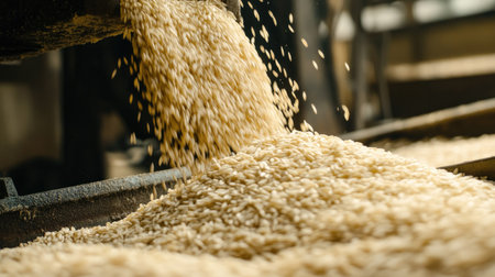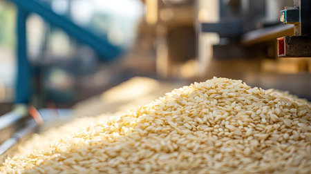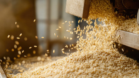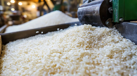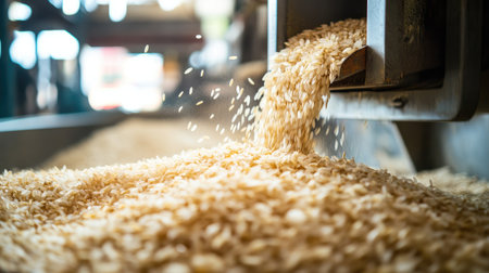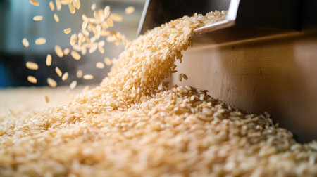 A close-up capture of freshly processed rice pouring from a milling machine in a bright workshop, showcasing the intricate texture and natural beauty of grains.