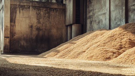 A large pile of golden grains sits in an industrial warehouse, illuminated by natural light. The textured walls create an atmospheric backdrop, highlighting the harvested crop.