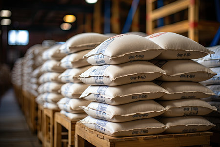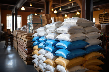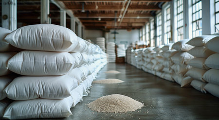 White bag rice or grits storage barn, Close-up of a warehouse with bulk rice or sugar bags in a distribution center, bulk rice procurement, production and transportation of rice, AI