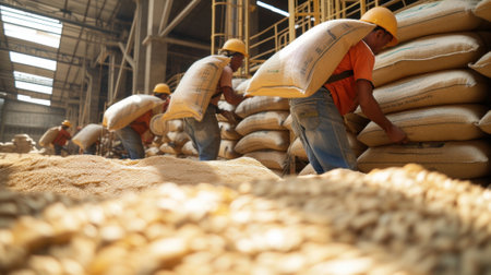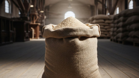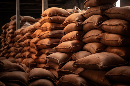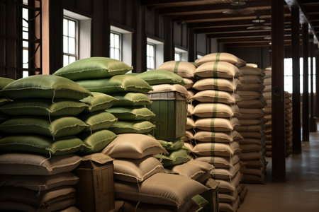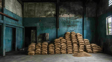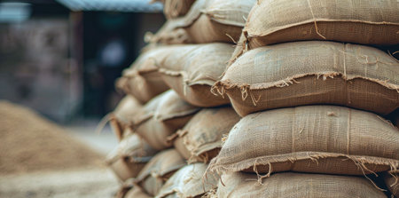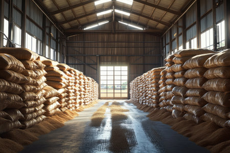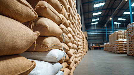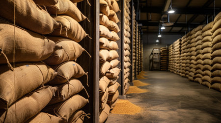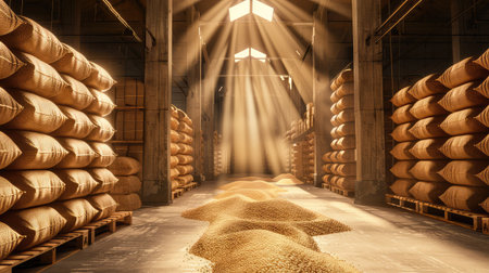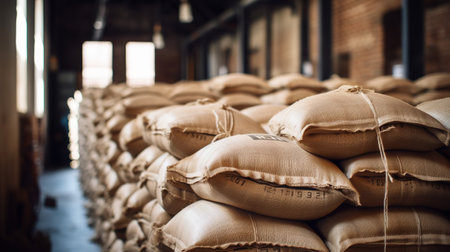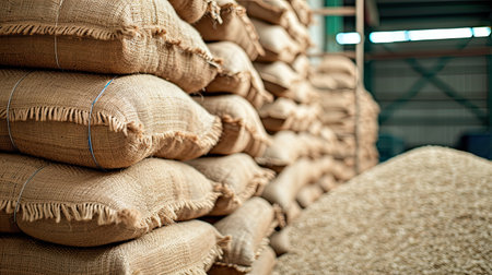 Bags of grain stacked in a storage area, creating a rustic atmosphere, earthy tones creating a warm, agricultural feel, ideal for farming or food industry concepts