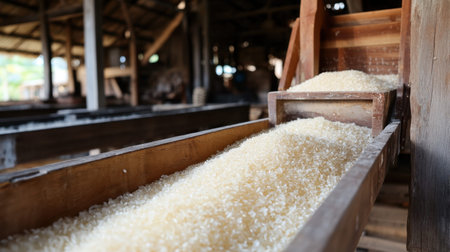 A detailed close-up image of white rice grains flowing through a traditional processing machine, capturing the essence of agricultural work and natural food preparation.