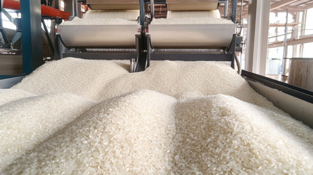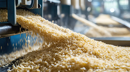 An industrial view showcasing processed rice on a conveyor belt, emphasizing the intricate details of grains in a production environment.