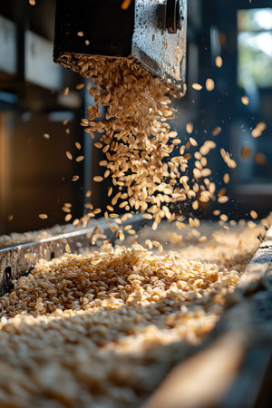 This image showcases a close-up view of grain being processed on a conveyor belt within a modern agricultural facility. The golden hue of the grain highlights the fresh harvest, emphasizing efficiency and technology in food production.