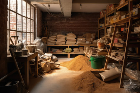 A captivating view of a grain storage facility illuminated by soft sunlight, casting beautiful shadows on bags and grain piles on the concrete floor.