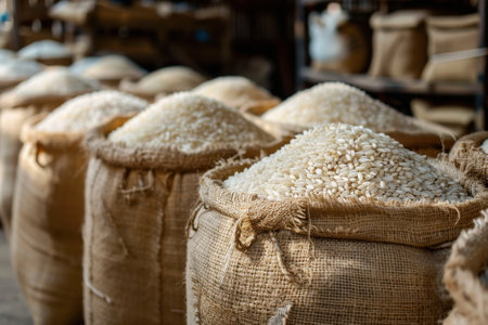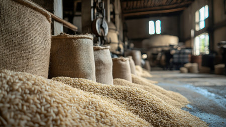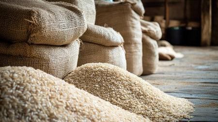 A Piles of rice in burlap sacks create rustic storage scene, showcasing abundance and natural textures
