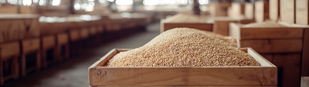 Sesame seeds harvested in wooden boxes in a warehouse. Natural organic fruit abundance. Healthy and natural food storing and shipping concept.