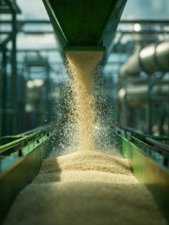 Golden grains cascade from a large metallic hopper, flowing steadily onto a moving conveyor within a sleek, high-tech factory featuring vibrant green frameworks and