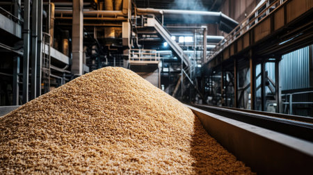 A captivating view of grain pelleting in an industrial environment shows machinery processing agricultural materials with dust and light enhancing the atmosphere.