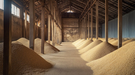 A spacious grain storage facility showcasing large piles of grains, with rustic wooden beams and a calm, agricultural atmosphere. The image captures the essence of rural storage.