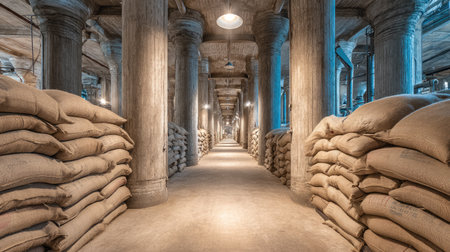 A captivating view of an industrial warehouse filled with stacked bags, rustic concrete pillars, and ambient lighting, perfect for exploring storage themes.