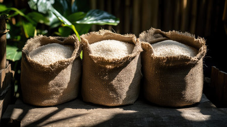 Three burlap bags filled with raw rice sit on a rustic wooden table. The warm, natural light illuminates the scene, enhancing the earthy texture and surrounding greenery.