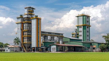 A modern grain facility in a rural area, showcasing machinery and storage structures surrounded by lush fields under a blue sky with clouds.
