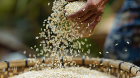 Close-up of rice grains pouring from a farmer's hand into a woven basket, symbolizing the abundance of the harvest season and the rewards of hard work