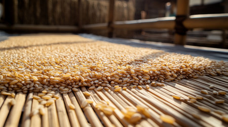 A close-up of rice grains drying under the sun, spread out on a traditional mat, showcasing the process of preparing the harvest for storage and consumption
