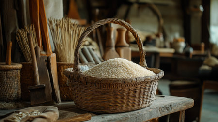A rustic basket filled with rice sits in a vintage workshop, showcasing a warm and inviting atmosphere ideal for food and rural settings.