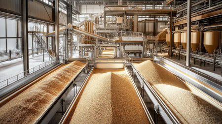 An industrial setting showcasing grain processing with wheat flowing from machinery into a storage area. The image captures the essence of agricultural production and efficiency.