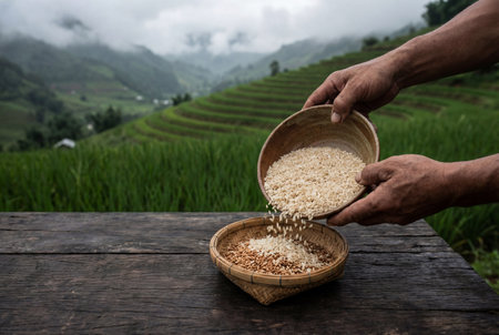 Male hands pour white rice grains from a ceramic bowl into a bamboo basket containing paddy seeds on a weathered wooden table against a misty backdrop of green mountain terraced fields in asia.