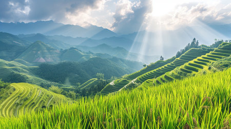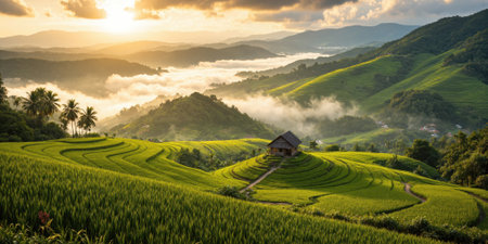 Rice Terraces Mountain Sunrise Stunning golden hour light over rice terraces and misty mountains landscape