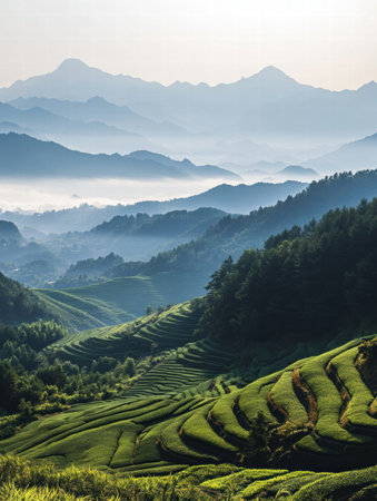 Rolling terraced lands filled with vibrant green crops stretch across the hills, with mist hovering over distant mountains at dawn.