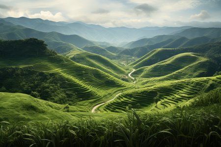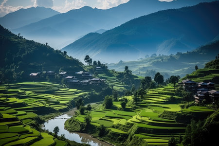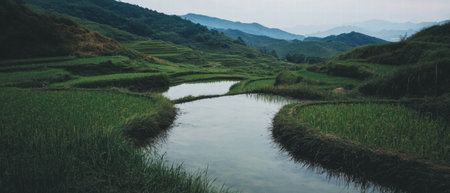Landscape of rice plantations in the mountains early morning. A beautiful and lush green hillside adorned with a serene river gracefully running through it. Generative AI