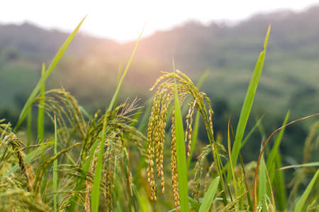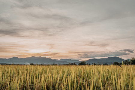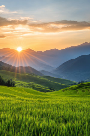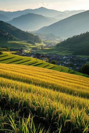 Golden rice fields on terraced hills during sunset in Asias serene landscape