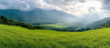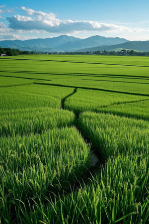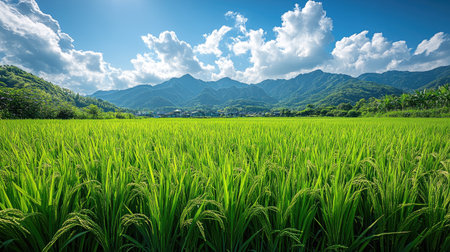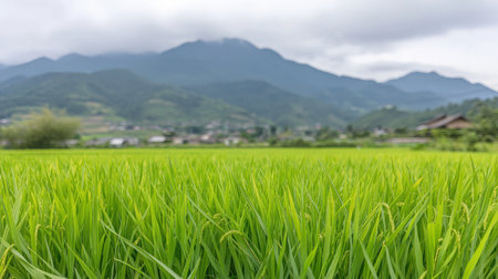 A vibrant rice field painted in lush green stretches towards distant mountains under a cloudy sky. The tranquil landscape embodies rural farming life and natural beauty.