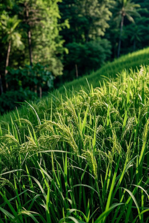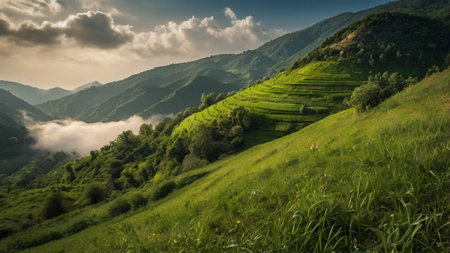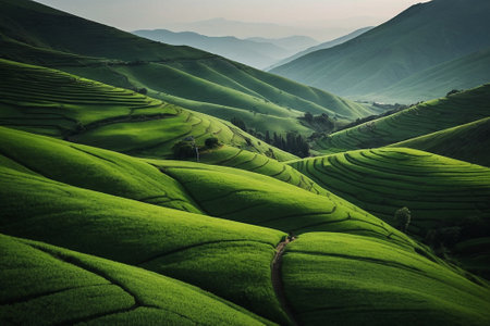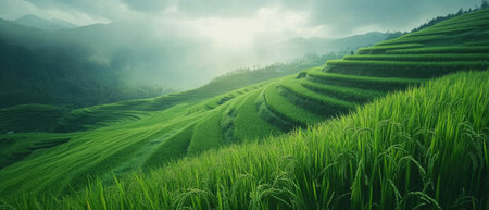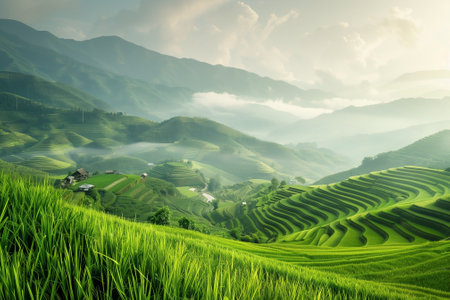 Lush green rice terraces nestled in mountainous landscape during early morning light