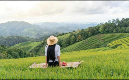 Beautiful sunset view of Pa Pong Peang rice terraces in northern Thailand with a lone traveler admiring the lush green landscape and mountain range.