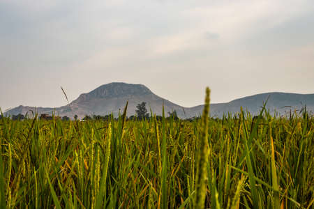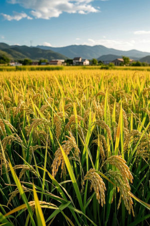 A panoramic view of a traditional rice paddy with tall, golden rice stalks ready for harvesting, set against a scenic rural backdrop.