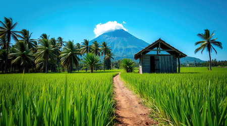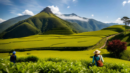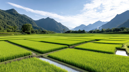 A Lush green rice paddies surrounded by majestic mountains under clear sky