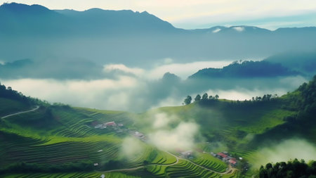 Cinematic view of lush green rice terraces amidst misty mountains during sunrise