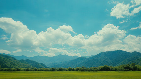Rice fields in the background of a blue sky and white clouds, with mountains visible in the distance. The rice is green against the bright blue sky, creating an endless expanse under clear skies. In the foreground, there's a small town visible near the horizon line, adding depth to the scene. This picturesque view captures Japan's rural landscape with its vastness, the contrast between colors, and the tranquil atmosphere created by nature's beauty. in the style of Photography. --chaos 30 --ar 16:9 --stylize 750 --v 6.1 Job ID: 8e720a99-6529-4fd4-89bb-175213de1b38