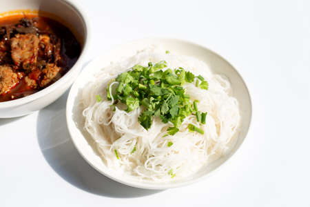 Rice noodles with Northern Thai pork curry in white plate on white background.