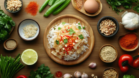A vibrant array of fresh ingredients for an Asian noodle dish featuring noodles, herbs, and spices. Perfect for creating healthy meals at home.