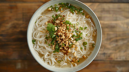A bowl of delicious rice noodles on a wooden table